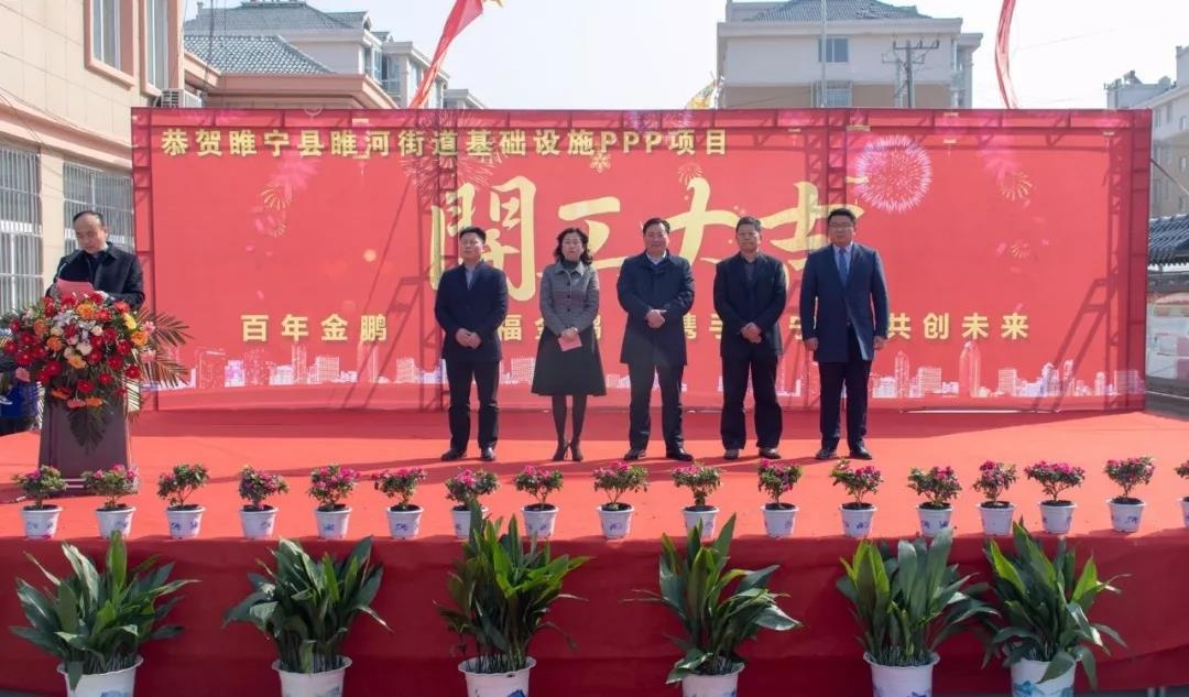 2019年3月11日上午10点,江苏省徐州市睢宁县睢河街道基础设施配套PPP项目开工典礼在睢宁县宁江工业园区举行,出席典礼的有睢河街道办事处书记宋振伟、睢河街道办事处主任任树生、睢河街道办事处主任仝玉强、金鹏控股集团投资发展中心副总经理兼金鹏投资集团副总裁周蓓、金鹏建设集团市政工程公司总经理郑冀东,睢河街道相关单位干部职工代表参加庆典共同见证了这一重要时刻。