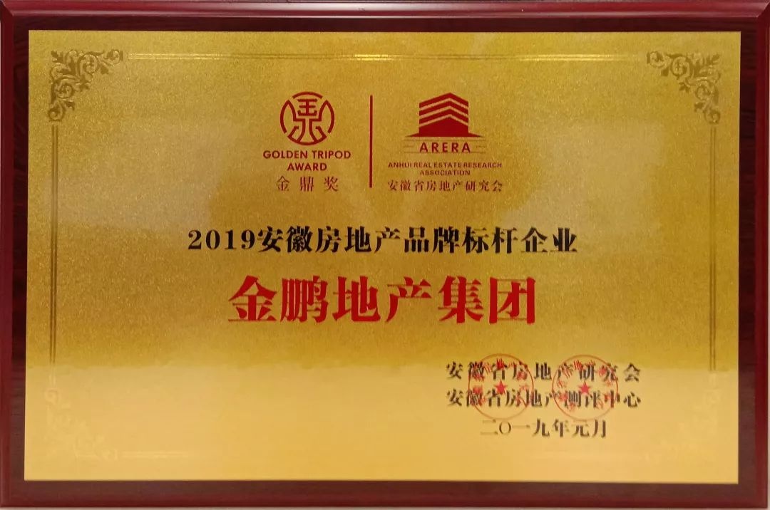 金鹏地产凭借突出成绩荣获“2019安徽房地产开发企业10强”和“2019安徽房地产品牌标杆企业”。金鹏地产创始人、金鹏控股集团董事长孙元武先生荣膺安徽地产20年20人功勋人物。