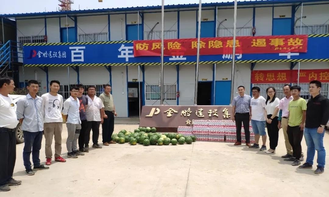 时刻关心一线工作,善待每一位辛勤劳作者!2019年6月26日,金鹏地产集团安徽区域公司开展“送清凉、送安全、送健康”防暑降温慰问活动,总经理助理孔令根携区域公司各管理层人员前往看望一线同事,行至合肥三个在建项目工地,对高新项目麓山院、滨湖新区项目壹品天成、肥东项目珑璟台的一线人员进行走访慰问,并送上防暑降温的物资。