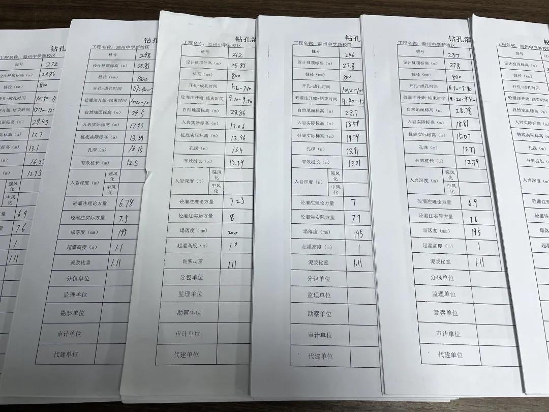 滁州中学新校区项目基础形式为独立基础,综合楼、科艺楼等部分楼栋为保证承载力要求,基础采用了桩基+独立基础形式,桩基为混凝土灌注桩。为保证地基与基础工程施工质量,项目与各参建方指派专人成立桩基工程施工专项验收小组,对桩基工程进行“一桩一验”,每道工序验收合格后方可进入下道工序施工,过程中验收资料形成“一桩一表”,保证施工过程质量可追溯性。