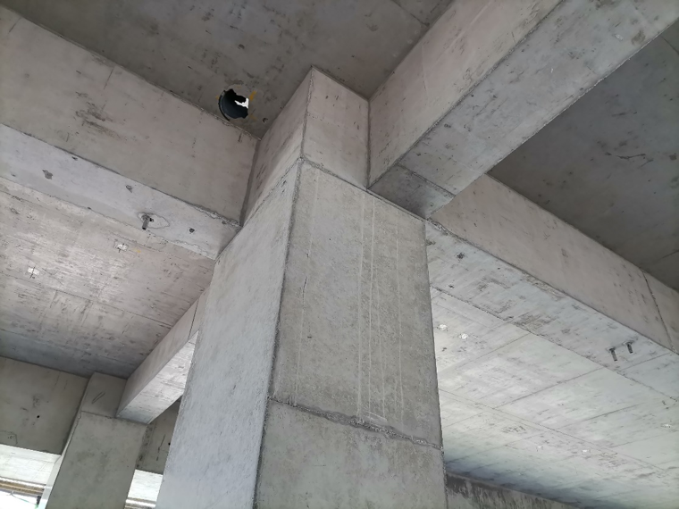 样板施工后梁、柱表面成型质量优良,经对柱模板垂直度、平整度等自检、纠偏及复查,综合合格率达100%;模板拆模后按照企业标准实测混凝土数据,达到GB50204-2015《混凝土结构工程施工质量验收规范》要求合格率100%。