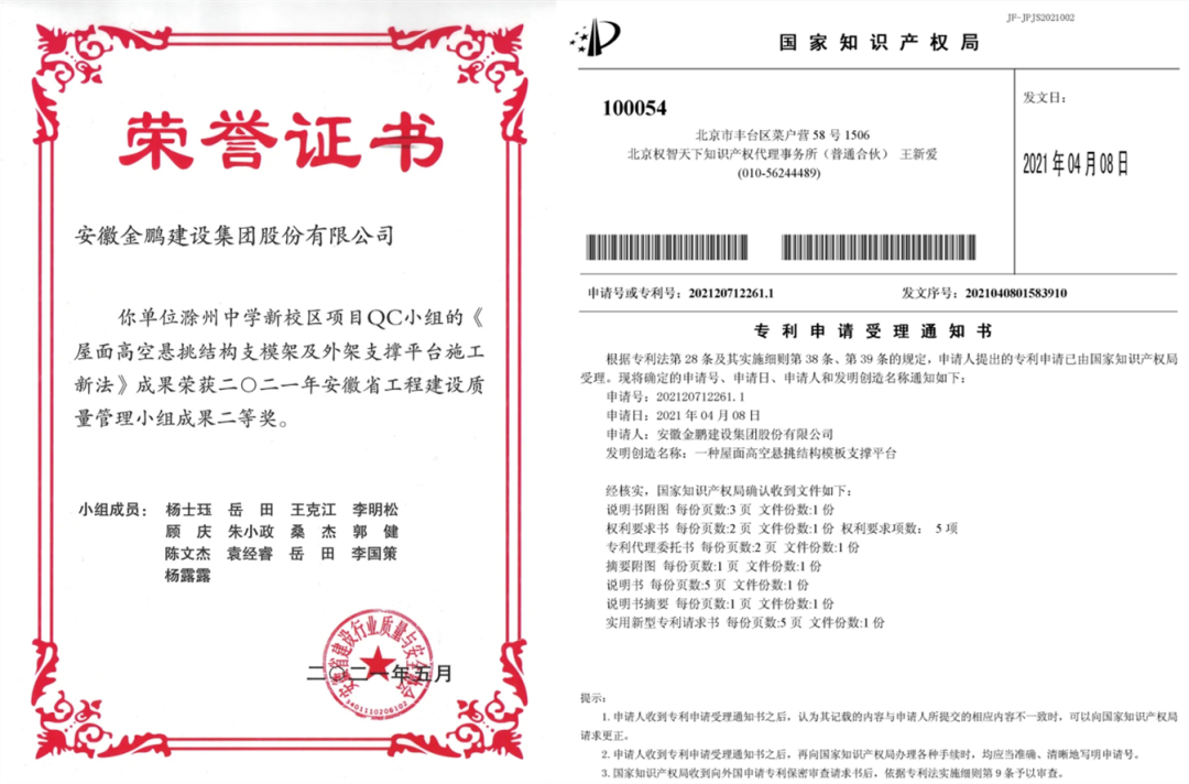 在金鹏建设集团技术发展中心的大力支持,项目全员的共同努力下,安徽省建筑业企业2021年QC小组活动中,该项目《屋面高空悬挑结构支模架及外架支撑平台施工新法》成果荣获二等奖,相关专利已受理。