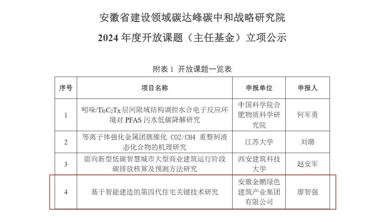 近日,安徽省建设领域碳达峰碳中和战略研究院公布了2024年度开放课题(主任基金)立项名单,其中,金鹏申报的“基于智能建造的第四代住宅关键技术研究”获得了开放课题立项。