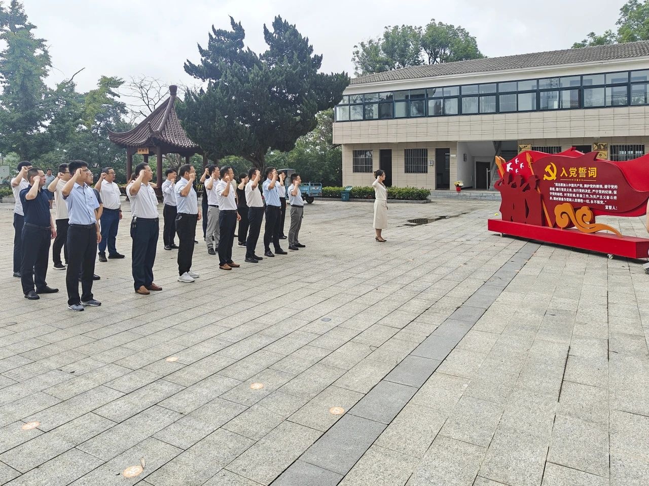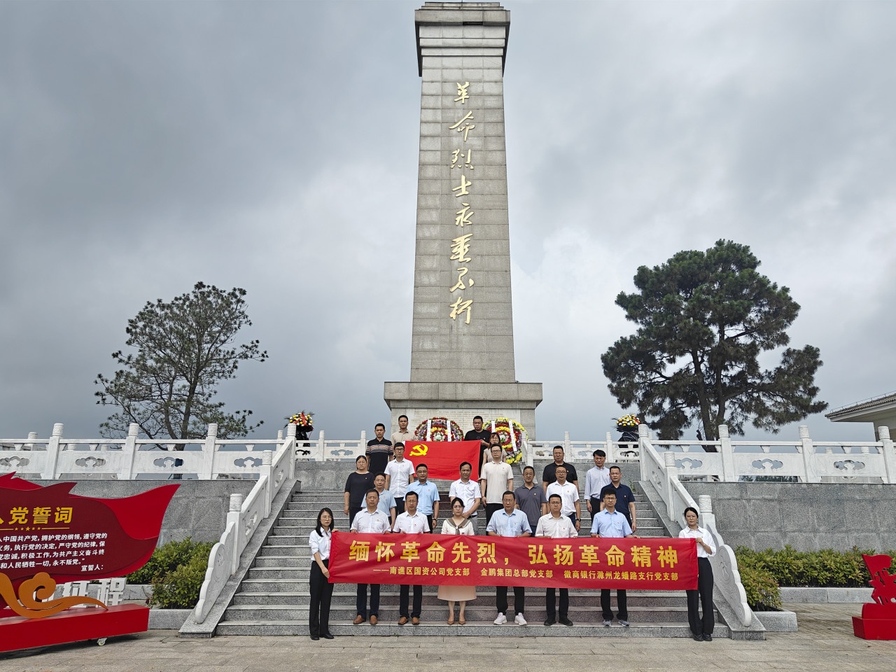 在革命烈士纪念碑前,徽商银行滁州分行龙蟠支行党支部书记、行长卢书权和金鹏控股集团党委副书记、副总裁张启国向革命烈士敬献花圈,同时,全体党员整齐列队,肃立于烈士纪念碑前,向革命先烈三鞠躬,表达对革命先烈的深切缅怀;南谯区国资公司党支部书记、董事长刘志青带领大家重温入党誓词,向党旗宣誓。