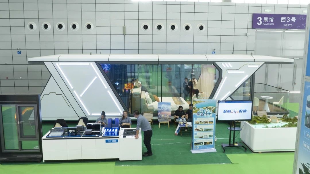金鹏高端文旅装备明星产品惊艳亮相博览会。造型极简又未来感十足的金鹏“太空舱”,长13米、宽3.3米、高3.4米,是此次展会上单体单舱最大的太空舱产品。产品从舱体到门窗,再到内部配置,全部是金鹏自有品牌,100%工业化生产,配备隔热、隔音、抗风压性能极佳的金鹏阳光门窗,并采用金鹏上尚家居全屋智能一体化设计。产品使用不限制地形、多景化应用。放海边、放山上、放戈壁、放沙漠、放草原……西藏、新疆、内蒙等地均适用。参观咨询的客商络绎不绝,纷纷进入太空舱内部亲身体验。