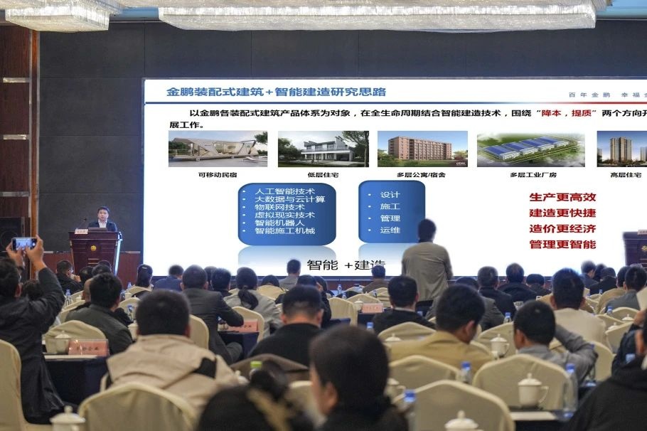 金鹏产业研究院院长廖智强作分享发言推介交流活动中,金鹏产业研究院院长廖智强分享了金鹏装配式建筑+智能建造的研究思路,介绍了金鹏成功打造的装配式高层住宅、装配式多层工业厂房等四大产品,并通过“金鹏5H好房”和“装配式多层工业厂房”具体实践项目,展示了金鹏在BIM设计与辅助分析、智能拆分、建造成本智能测算、智慧工厂、智能生产设备、智慧工地、全流程项目协同管理系统等“智能建造”实践成果。