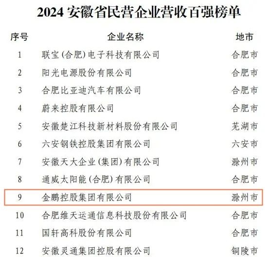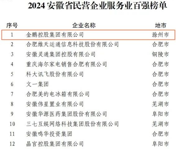 11月29日,2024安徽省民营企业百强发布会在合肥召开。省工商联、省工信厅、省市场监管局权威发布2024安徽省民企营收百强、制造业百强、服务业百强榜单。金鹏控股集团持续稳健发展,今年已连续八年位列安徽民营企业百强榜前10位,同时位列民企服务业百强榜第1位。