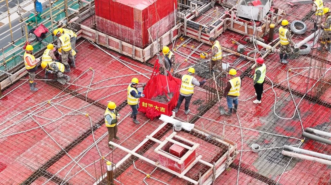 孙元武董事长宣布金鹏·云境6#楼封顶仪式正式开始,现场礼炮齐鸣、彩带纷飞,相关领导挥动金铲,将混凝土注入吊斗,并观礼混凝土起吊。封顶仪式结束后,现场人员共赴品质巡查现场,从2#楼到中央景观,再到6#楼样板间,通过实地巡视检查,全面感受项目的精细化营造力。